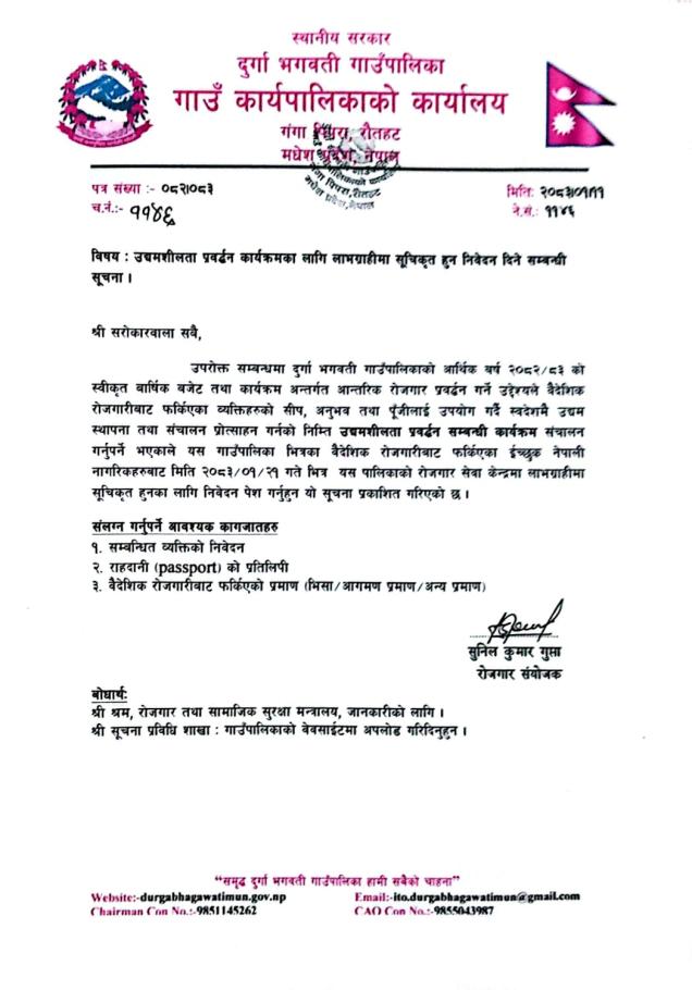 उधमशीलता प्रवर्द्धन कार्यक्रमका लागि लाभग्राहीमा सूचिकृत हुन निवेदन दिने सम्बन्धी सूचना