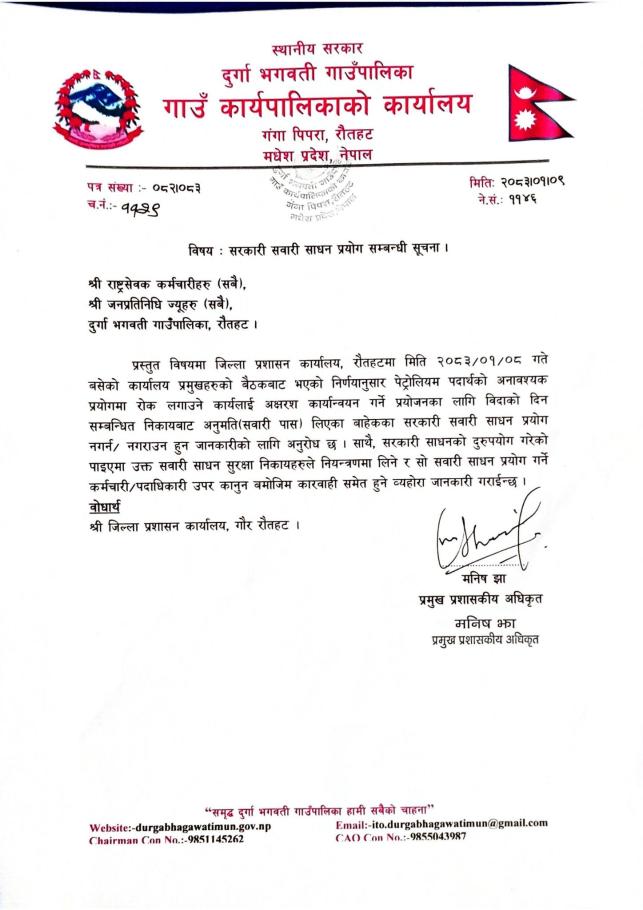 मिति २०७५/१/२६ गते का दिन दुर्गा भगवती गाउँ पालिका जिल्लाको प्रथम खुल्ला दिशा मुक्त गाउँ पालिका घोषणा हुन सफल भएकोमा सम्पूर्ण गाउँ बासी लाई हार्दिक बधाइ |