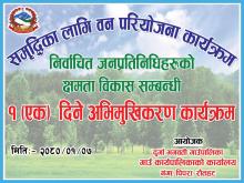 मिति २०८०/०१/०७ गतेका दिन गा.पा. अध्यक्ष श्री शम्भु कुमार सिंह ज्यूको अध्यक्षतामा समृद्धिका लागि वन परियोजना कार्यक्रम अन्तर्गत एक दिने अभिमुखीकरण कार्यक्रम सम्पन्न भएको छ उक्त कार्यक्रममा मधेश प्रदेश परियोजना प्रमुख राजीवकुमार झा, प्र.प्र.अ. नितेश कुमार