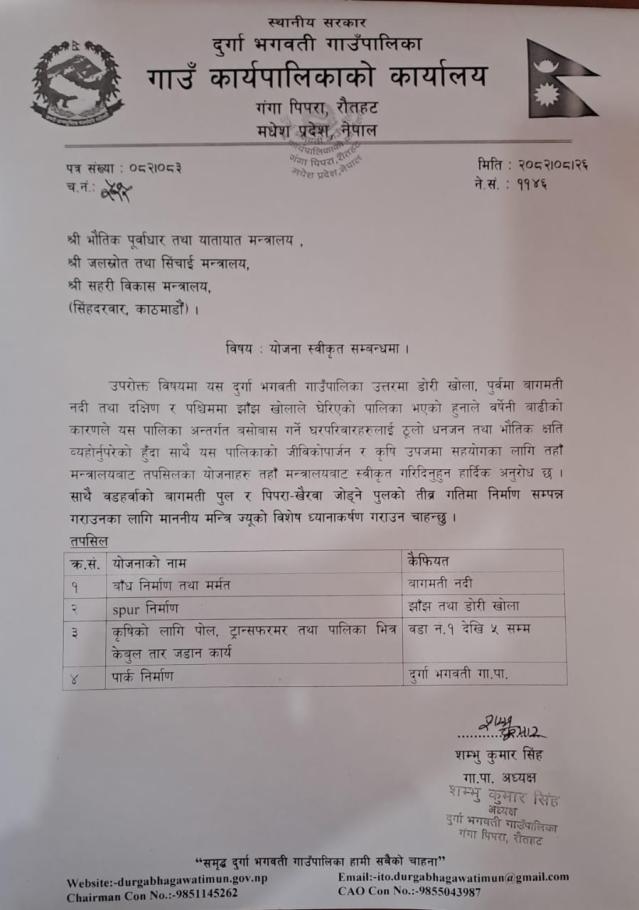 गा.पा. अध्यक्ष ज्यूले रौतहट-सर्लाही जोड्ने वडहर्वा र पिपराघाटको पुल तीव्र गतिमा समयमै सक्नु पर्ने भनि मा.मन्त्रि कुलमान घिसिङ्ग ज्यूलाई ध्यानकर्षण गराउनुभएको छ साथै यस पालिकाको लागि अत्यावश्यक योजना स्वीकृतिका लागि माग गर्नु भएको छ 12/14/2025 - 12:18 , ,